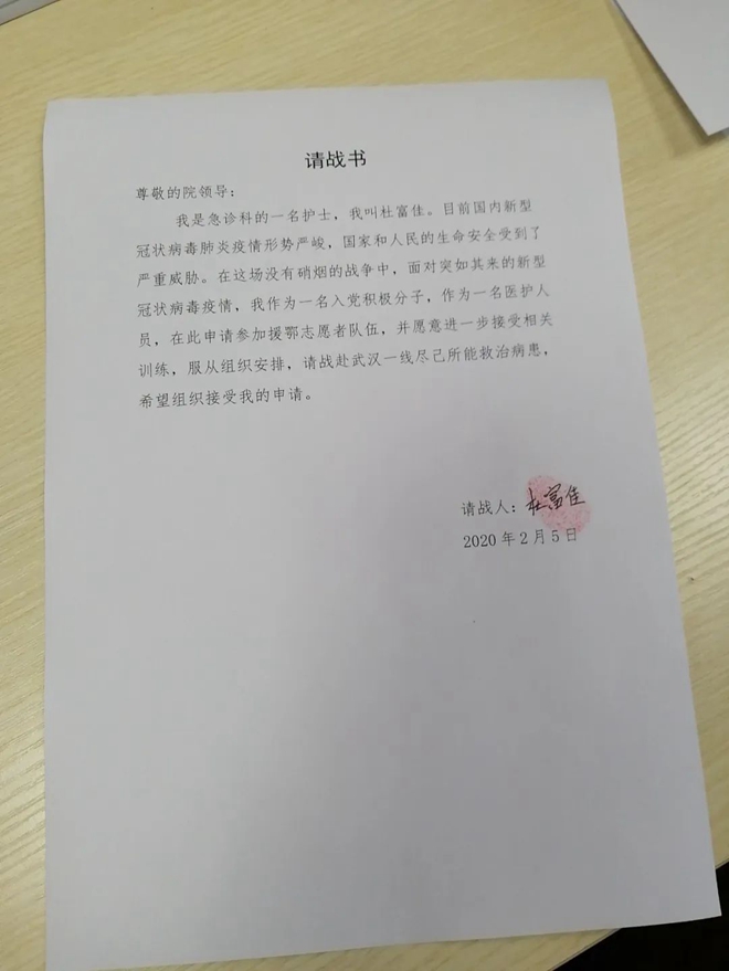 杜富佳的请战书