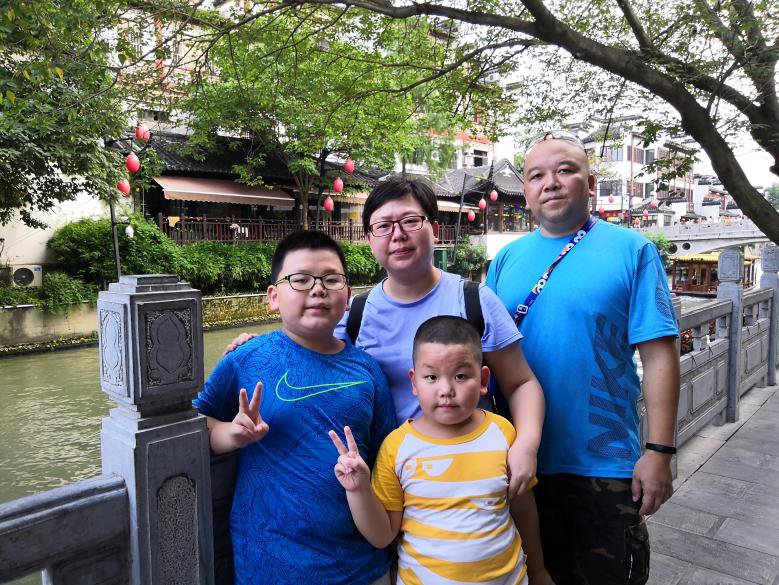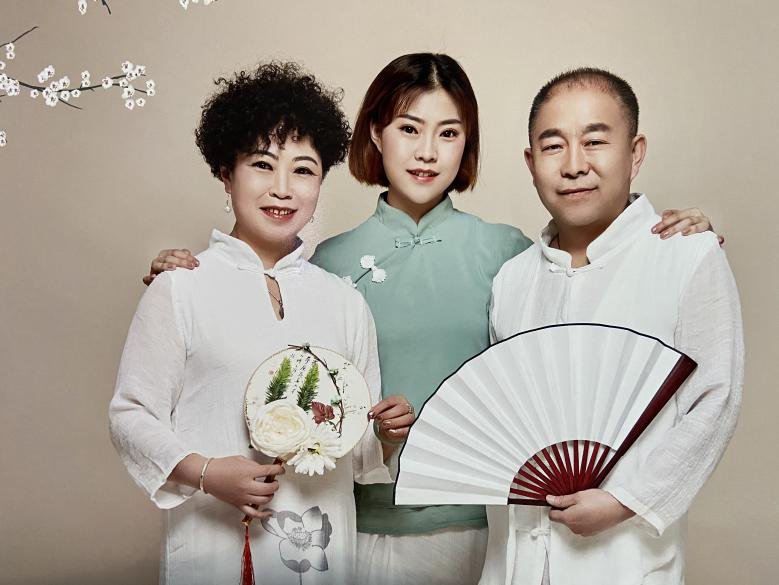 师华仙(左二)一家4年前拍摄的全家福翻拍照。王春艳摄