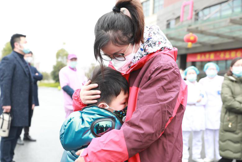 孙晓兰紧紧搂住前来送行的儿子。江苏南京医科大学附属逸夫医院供图