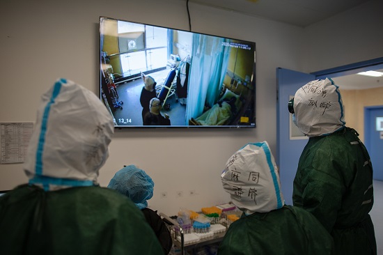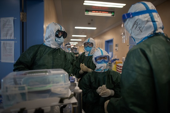 2月20日,同济医院光谷院区,即将进ICU的“敢死队”在穿戴防护装备。所有人都要经过院感护士的检查,才能进入隔离区域。