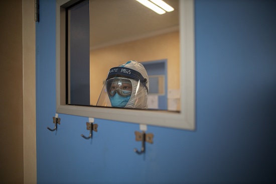 结束任务的队员在等候着脱掉防护服,走出4个隔离区,才可稍微放松一些。