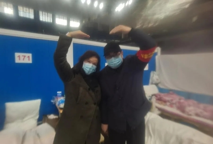 人民网湖北频道记者张婵为洪山体育馆武昌方舱医院的患者拍合影。
