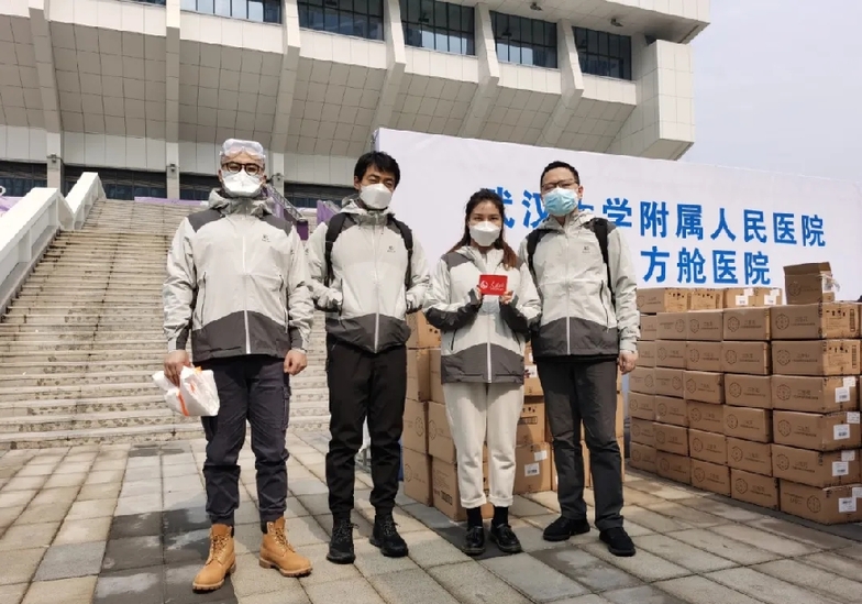 2月21日,人民网记者进入洪山体育馆武昌方舱医院采访前合影。右二为记者张婵。