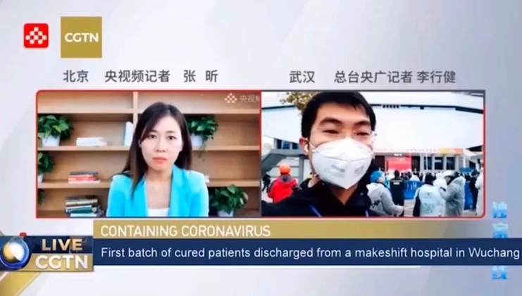 2月11日,中央广播电视总台中国之声特别报道部记者李行健在武昌方舱医院前与央视频连线,并通过CGTN等平台同步直播。