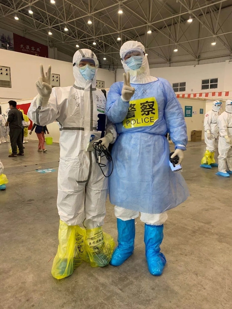 武汉广播电视台新闻频道深度资讯部记者李永杰(左)在武汉客厅方舱医院病区内偶遇东西湖区交通大队汉警快骑队民警张敬畏。