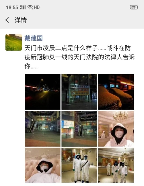 2月5日,天门市委发出全市干部职工就近参加村(社区)疫情防控工作的号召后,天门法院党组认真组织,狠抓落实。戴建国积极响应,第一时间赶到竟陵街道办事处鸿渐社区报到,被安排到新城集中留观点某酒店值班。