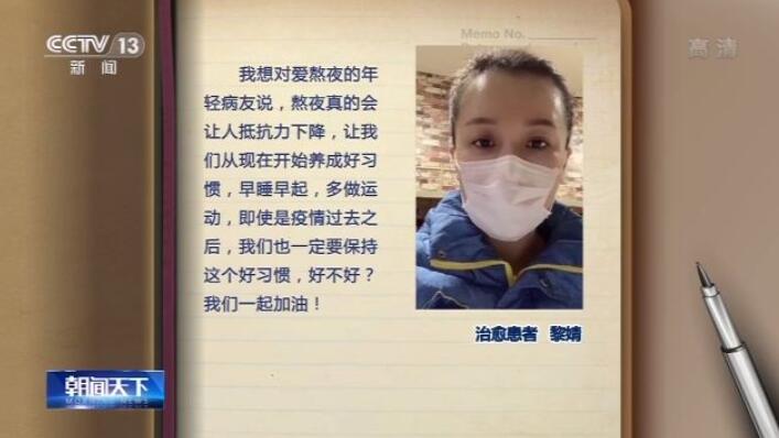 我想对爱熬夜的年轻病友说,熬夜真的会让人抵抗力下降,让我们从现在开始养成好习惯,早睡早起,多做运动,即使是疫情过去之后,我们也一定要保持这个好习惯,好不好?我们一起加油! ——治愈患者黎婧