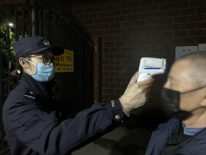 胡馨月在夜晚巡查中为外出的群众检测体温。(受访者供图)