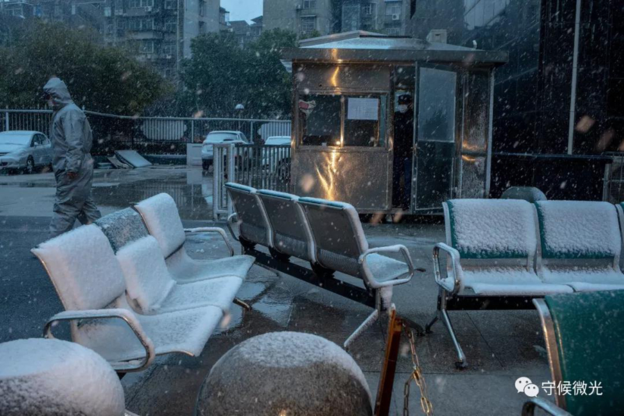 2月15日,湖北省武汉市武昌区,湖北大中中医院门前,一名工作人员经过。椅子上已经落了厚厚一层雪。中国青年报 李隽辉/摄