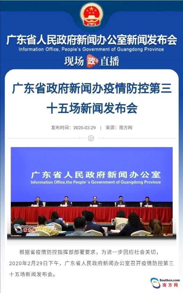 “广东各地不会‘封城’”“广东各类企业复工时间不早于2月9日24时”“调整相应级别,不代表疫情拐点的到来”……从1月21日到2月29日,广东省人民政府新闻办公室已累计举行35场疫情防控新闻发布会。每一场新闻发布会的召开,既是对广东疫情防控最新进展的介绍,也是对民众关心的热点话题的回应。从一线传染病学专家解读新冠肺炎救治情况,到各地市全力保障企业复工复产,广东疫情防控新闻发布会不断用权威准确的信息增强公众战胜疫情的信心。