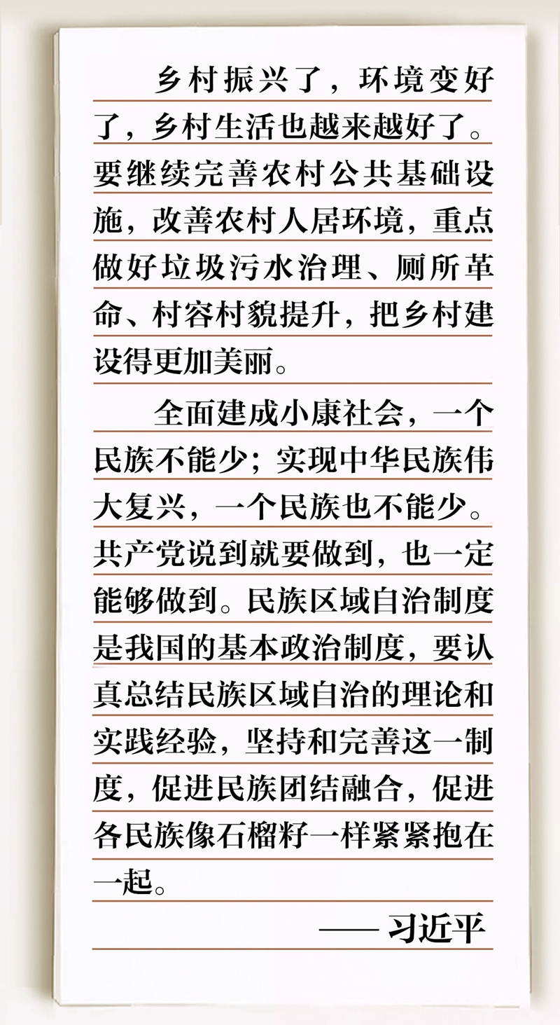 习近平总书记指出:“各族人民亲如一家,是中华民族伟大复兴必定要实现的根本保证。”马鞍山村脱贫攻坚动力不竭,村民生活蒸蒸日上,既源于党和政府的好政策,更是因为各族群众同心同德、同心同向。这也启示我们:56个民族携手同行,像石榴籽一样紧紧抱在一起,铸牢中华民族共同体意识,就能形成勇往直前、无坚不摧的强大力量。
