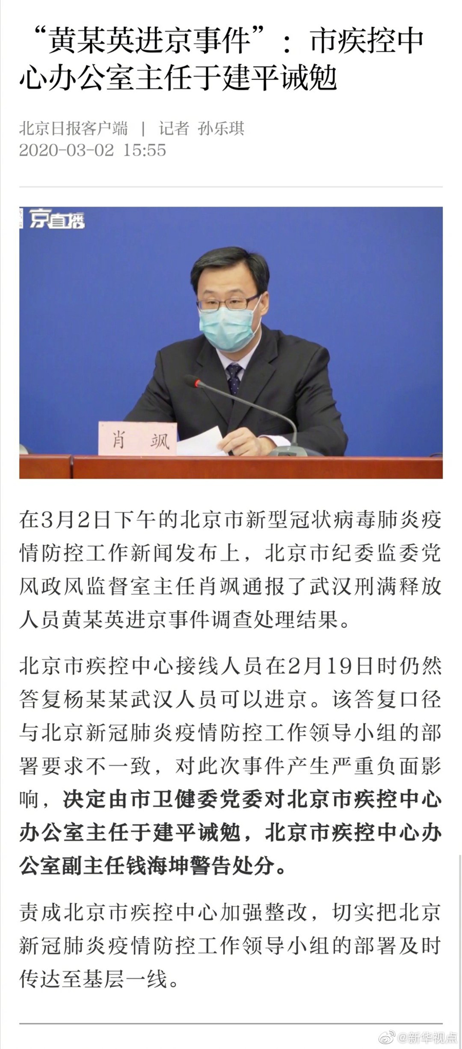 “黄某英进京事件”:北京市疾控中心办公室主任于建平诫勉-新华网