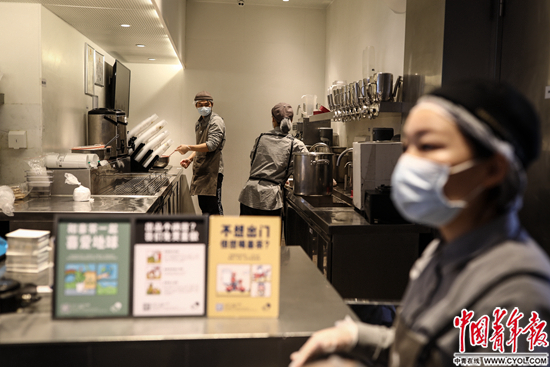 喜茶汉街LAB店和大多数店铺一样暂停营业了。2月22日,中青报·中青网记者实地探访时发现,空空荡荡的店铺里摆着一排排装满食物的纸袋,10名工作人员戴着口罩,如往常一样在忙碌地制作奶茶和面包。