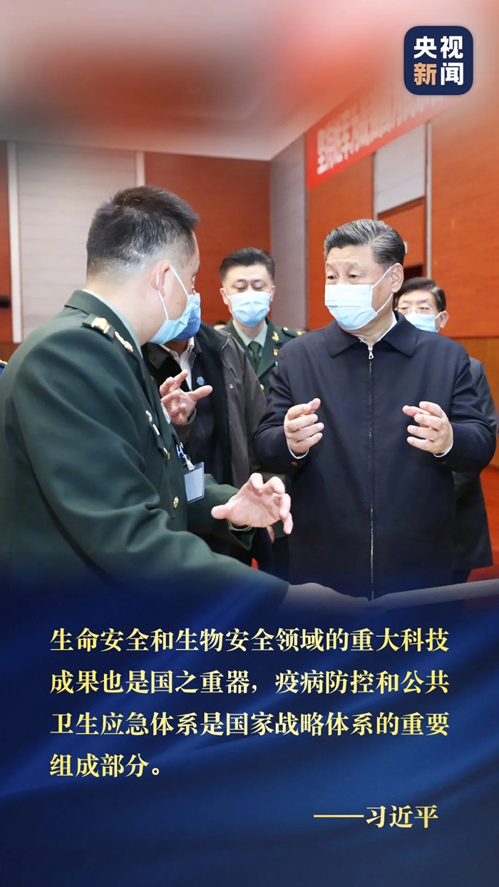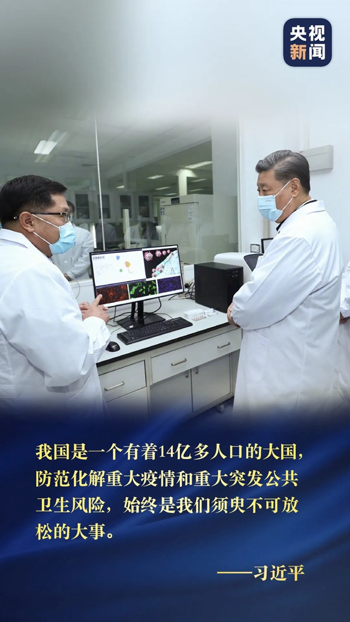 习近平总书记2日在北京考察新冠肺炎防控科研攻关工作,他强调,我国是一个有着14亿多人口的大国,防范化解重大疫情和重大突发公共卫生风险,始终是我们须臾不可放松的大事。