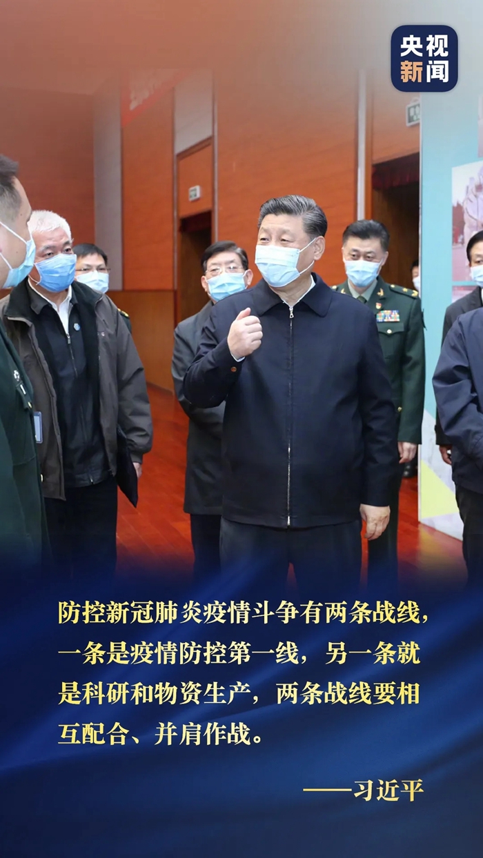 防控新冠肺炎疫情斗争有两条战线,一条是疫情防控第一线,另一条就是科研和物资生产,两条战线要相互配合、并肩作战。