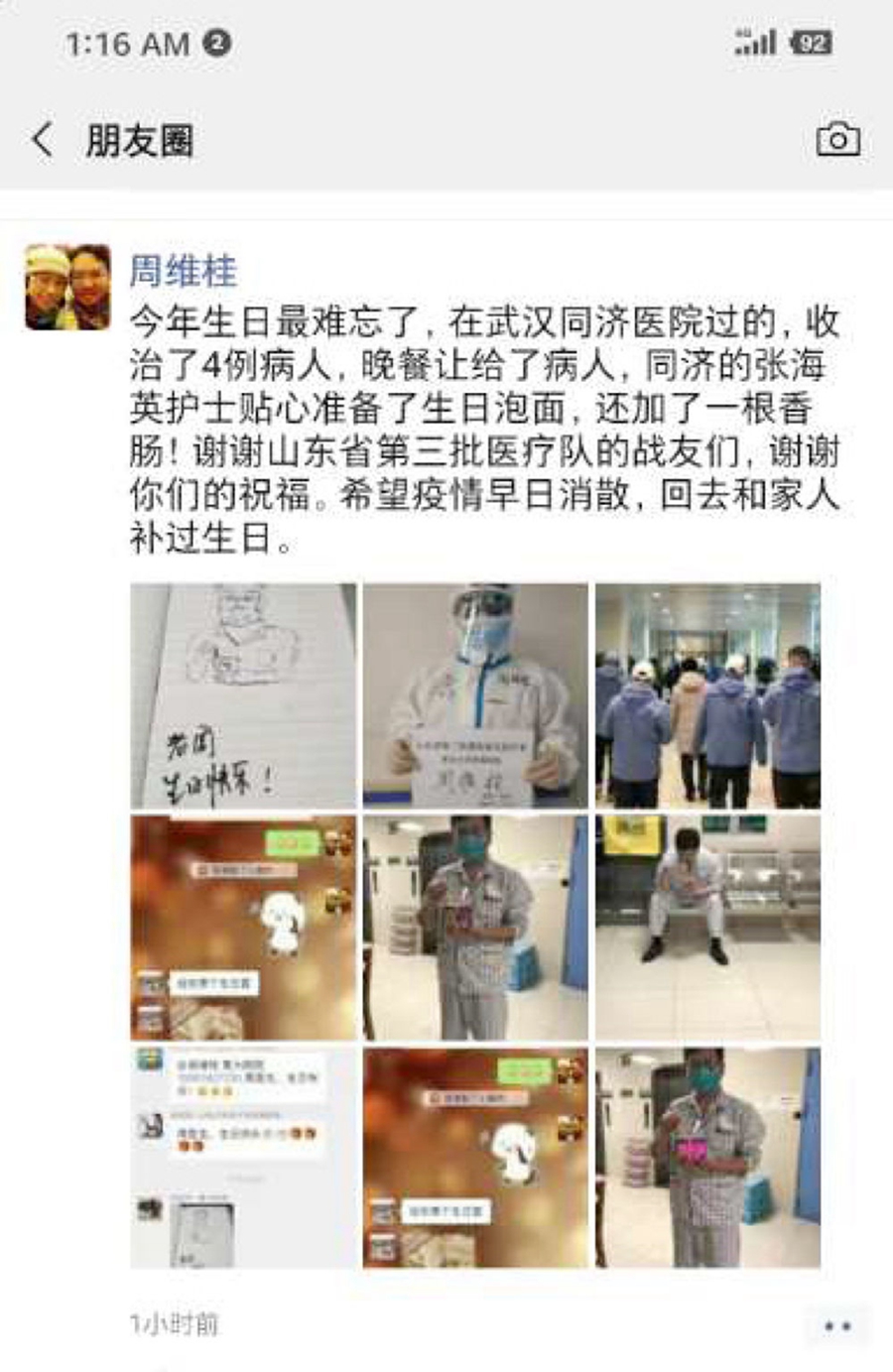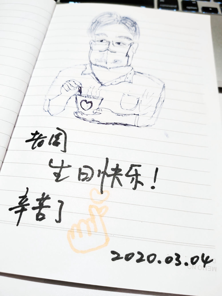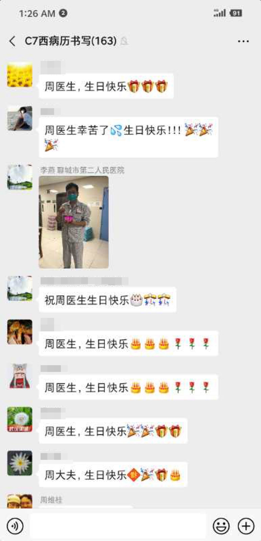 原来是同事们在微信工作群里为他送来了生日祝福