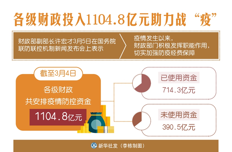 新华社北京3月5日电(记者申铖、刘红霞)财政部副部长许宏才5日在国务院联防联控机制新闻发布会上表示,疫情发生以来,财政部门积极发挥职能作用,切实加强防疫经费保障,截至3月4日,各级财政共安排疫情防控资金1104.8亿元。