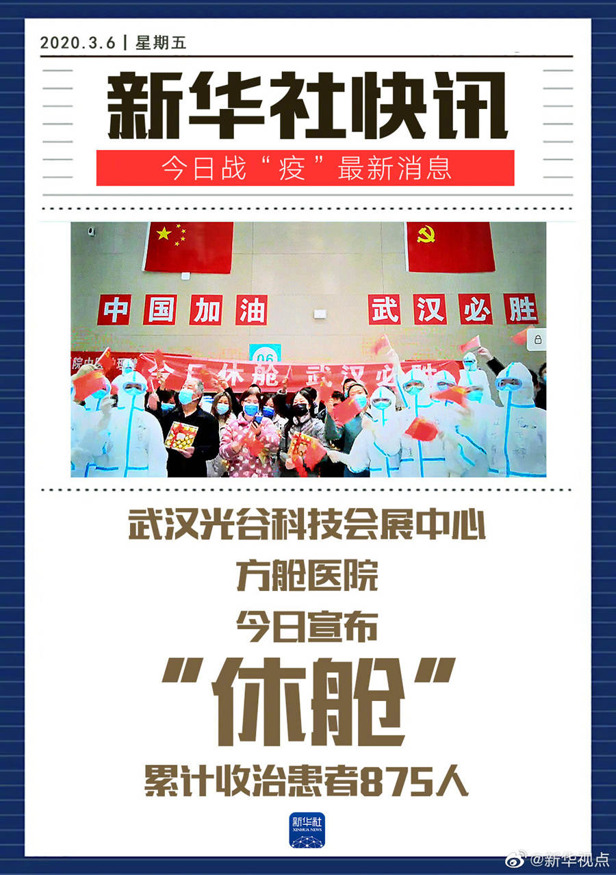 3月6日,武汉光谷科技会展中心方舱医院宣布“休舱”。2月17日,该方舱医院正式开始收治患者,累计收治患者875人。