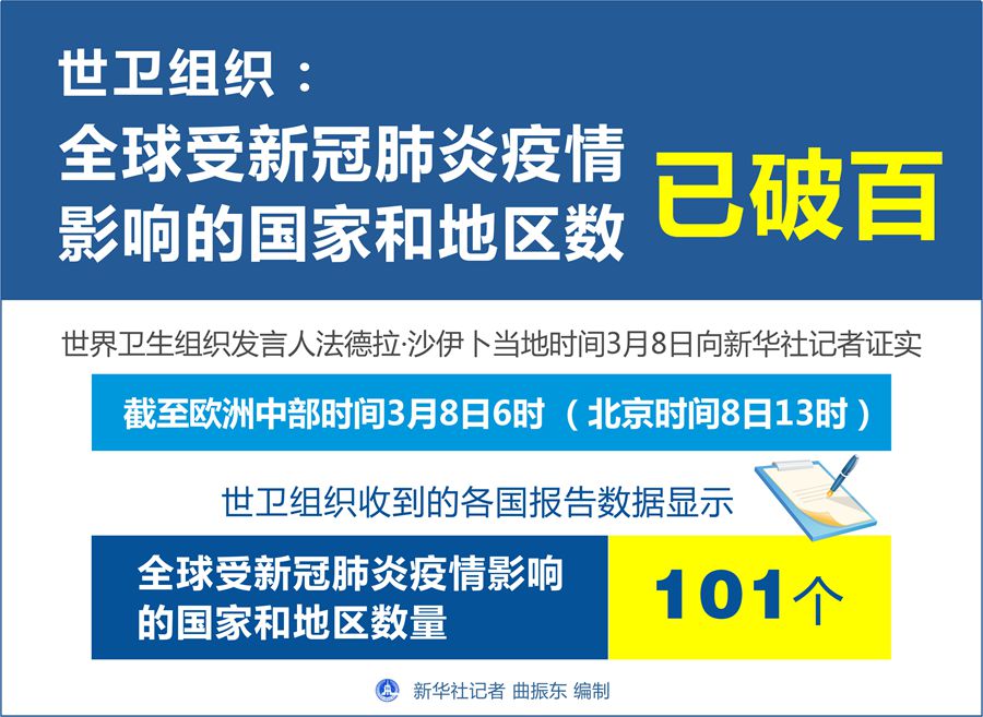 新华社日内瓦3月8日电(记者刘曲 陈俊侠 沈忠浩)世界卫生组织发言人法德拉·沙伊卜8日向新华社记者证实,截至欧洲中部时间8日6时(北京时间8日13时),世卫组织收到的各国报告数据显示,全球受新冠肺炎疫情影响的国家和地区数量已达101个。