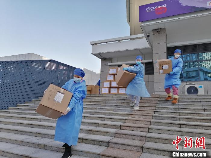 近日,武昌方舱医院“管家”、武汉大学人民医院对外联络部牵头负责人沈岚接受记者采访。图为沈岚(左一)在方舱医院搬运物资。 武大人民医院供图