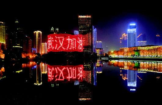 ▲1月31日,武汉市武昌区水果湖地区一处建筑外墙打出“武汉加油”字样。 新华社记者程敏摄