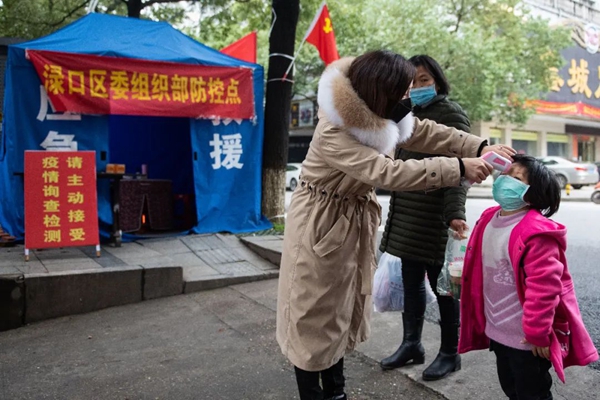 3月4日,在湖南省株洲市渌口区一住宅小区前的值守点,工作人员为居民测量体温。新华社发陈思汗摄