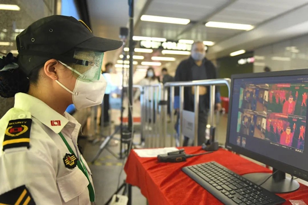 3月9日,在广州地铁海珠广场站,工作人员通过红外线体温仪对进站乘客体温进行监测。新华社记者 卢汉欣 摄