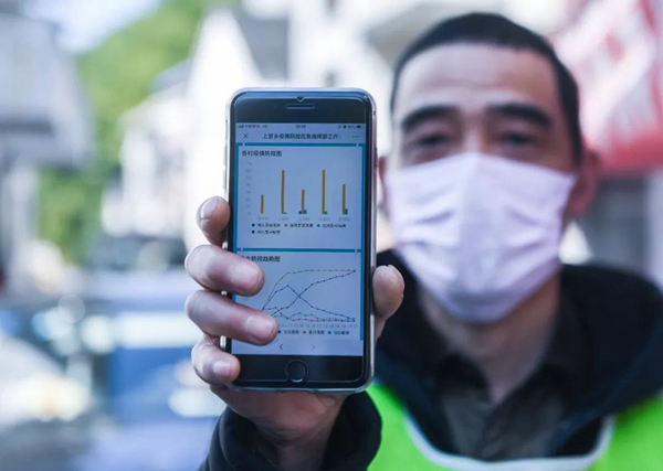 2月20日,在浙江省杭州市富阳区上官乡芳村检查点,工作人员展示手机上的“疫情防控云图”的实时数据。新华社记者 徐昱 摄
