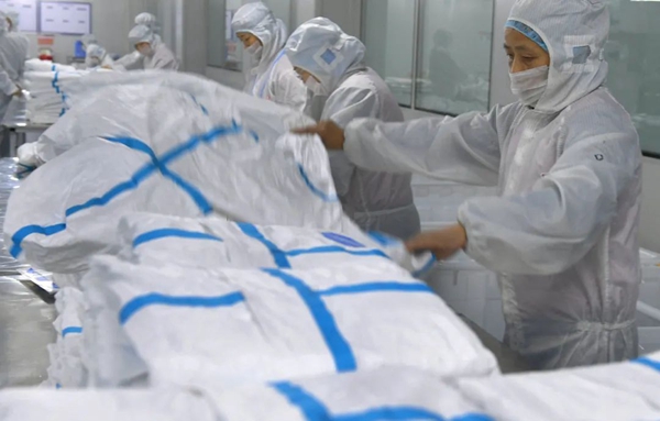 1月27日,安徽省六安市裕安区一家医疗科技有限公司的工人在加工防护服。新华社发(陈力 摄)