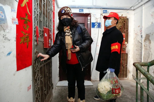 武汉市江岸区花桥社区志愿者蒋晨一(左)和下沉社区的干部谢文先来到一名独居老人家为其送菜(2月20日摄)。新华社记者沈伯韩摄