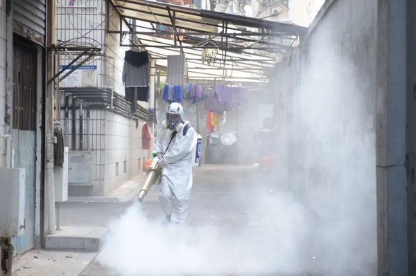 2月5日,长沙蓝天救援队队员在长沙市马王街社区内消毒杀菌。新华社发(陈振海摄)