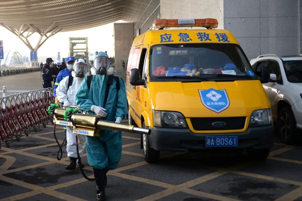 2月5日,长沙蓝天救援队队员准备进入长沙磁浮高铁站消毒杀菌。新华社发(陈振海摄)