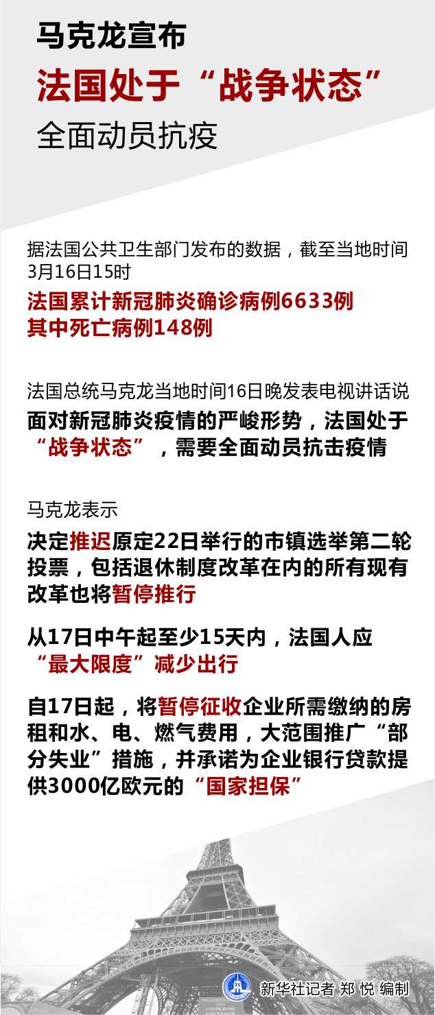 新华社巴黎3月16日电(记者徐永春 唐霁 陈晨)法国总统马克龙16日晚发表电视讲话说,面对新冠肺炎疫情的严峻形势,法国处于“战争状态”,需要全面动员抗击疫情。