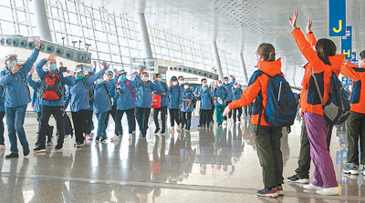 3月17日,在武汉天河机场,山东国家紧急医学救援队队员(左侧)向江苏国家紧急医学救援队队员挥手致意。新华社记者 熊琦摄
