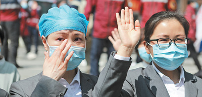 3月17日,甘肃省第二批支援武汉医疗队离开位于武汉东西湖的驻地,驻地工作人员深情相送。本报记者 李舸摄