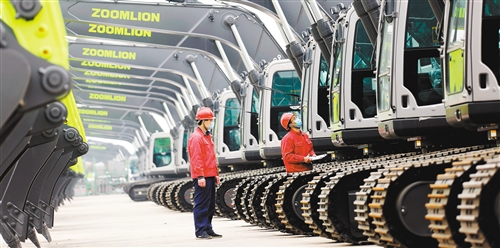 位于陕西省渭南高新区的中联重科渭南工业园内,检验人员对即将出厂的挖掘机检查验收。崔正博摄(中经视觉)