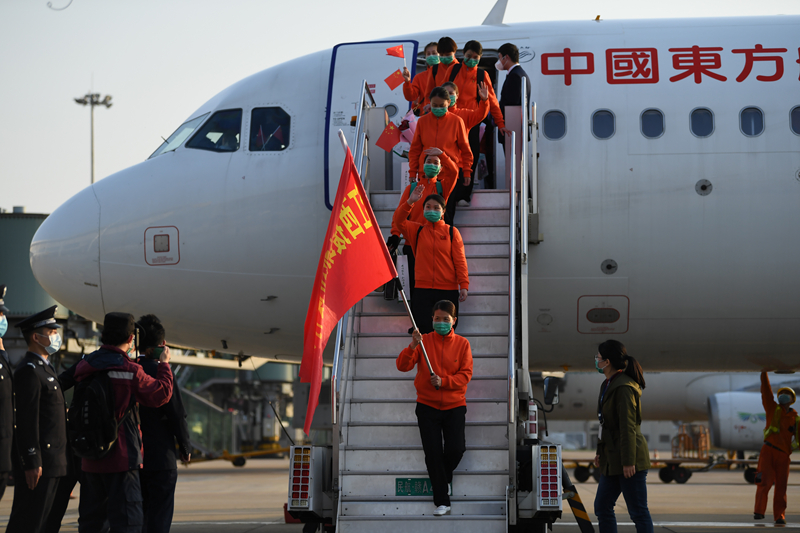 3月19日18时许,江西第二批援助武汉医疗队(江西援助武汉医疗护理队)在圆满完成武汉新冠肺炎患者医疗救治任务后,平安返赣。时雨摄