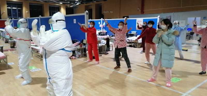 青海医护人员带领患者们一起做运动。青海省支援湖北护理医疗队供图