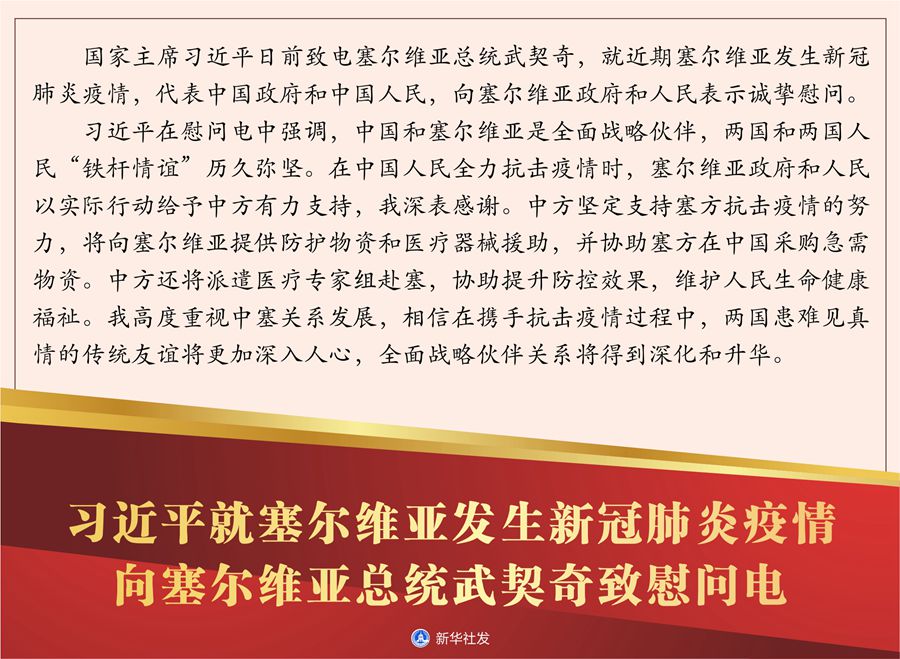 习近平在慰问电中强调,中国和塞尔维亚是全面战略伙伴,两国和两国人民“铁杆情谊”历久弥坚。在中国人民全力抗击疫情时,塞尔维亚政府和人民以实际行动给予中方有力支持,我深表感谢。中方坚定支持塞方抗击疫情的努力,将向塞尔维亚提供防护物资和医疗器械援助,并协助塞方在中国采购急需物资。中方还将派遣医疗专家组赴塞,协助提升防控效果,维护人民生命健康福祉。我高度重视中塞关系发展,相信在携手抗击疫情过程中,两国患难见真情的传统友谊将更加深入人心,全面战略伙伴关系将得到深化和升华。