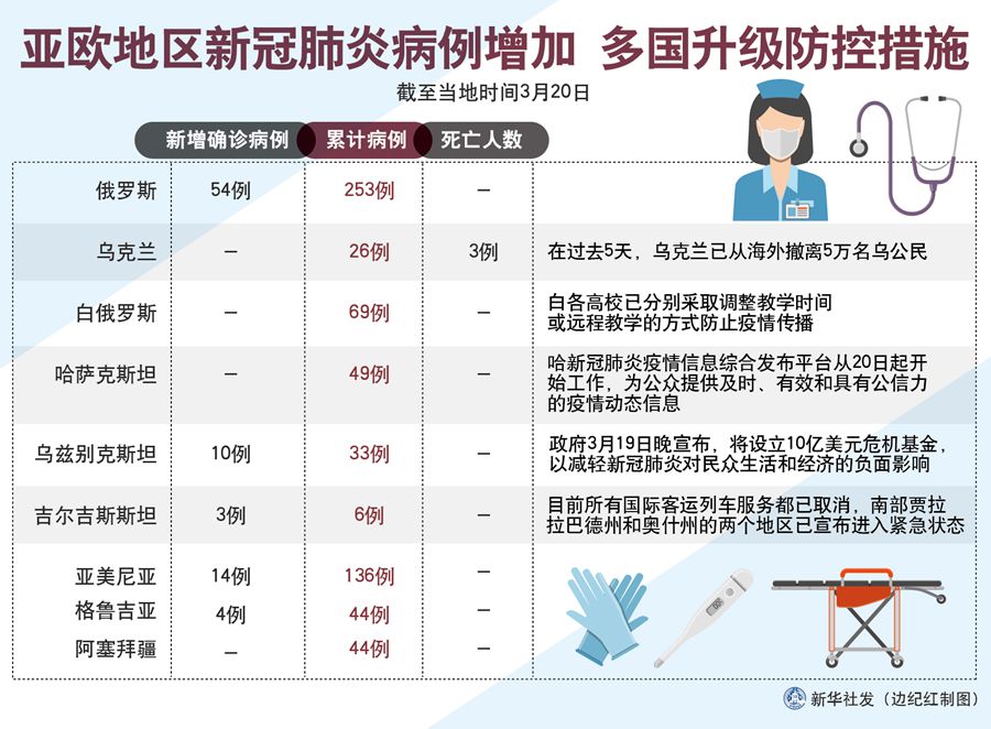 新华社莫斯科3月21日电 综合新华社驻亚欧地区记者报道:亚欧地区新冠肺炎确诊病例20日继续增加,多国采取暂停客运等防控措施。