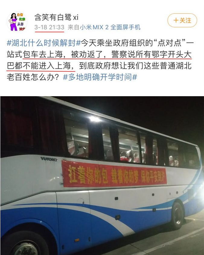 18日晚,有从湖北前往上海的网友在微博上发帖称,自己从湖北大冶出发,紧随其后的还有湖北黄冈蕲春、宜昌的包车,到达苏州市汾湖卡口后,均被劝退。有同样遭遇的还有仙桃、孝感的返程务工人员。