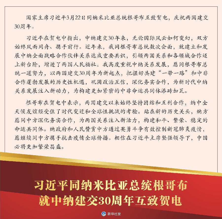 新华社北京3月22日电 国家主席习近平3月22日同纳米比亚总统根哥布互致贺电,庆祝两国建交30周年。