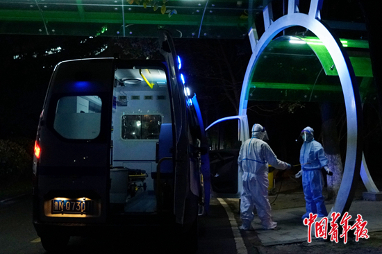 一位发热病人被救护车送进金银潭医院,司机对随行人员进行消杀。