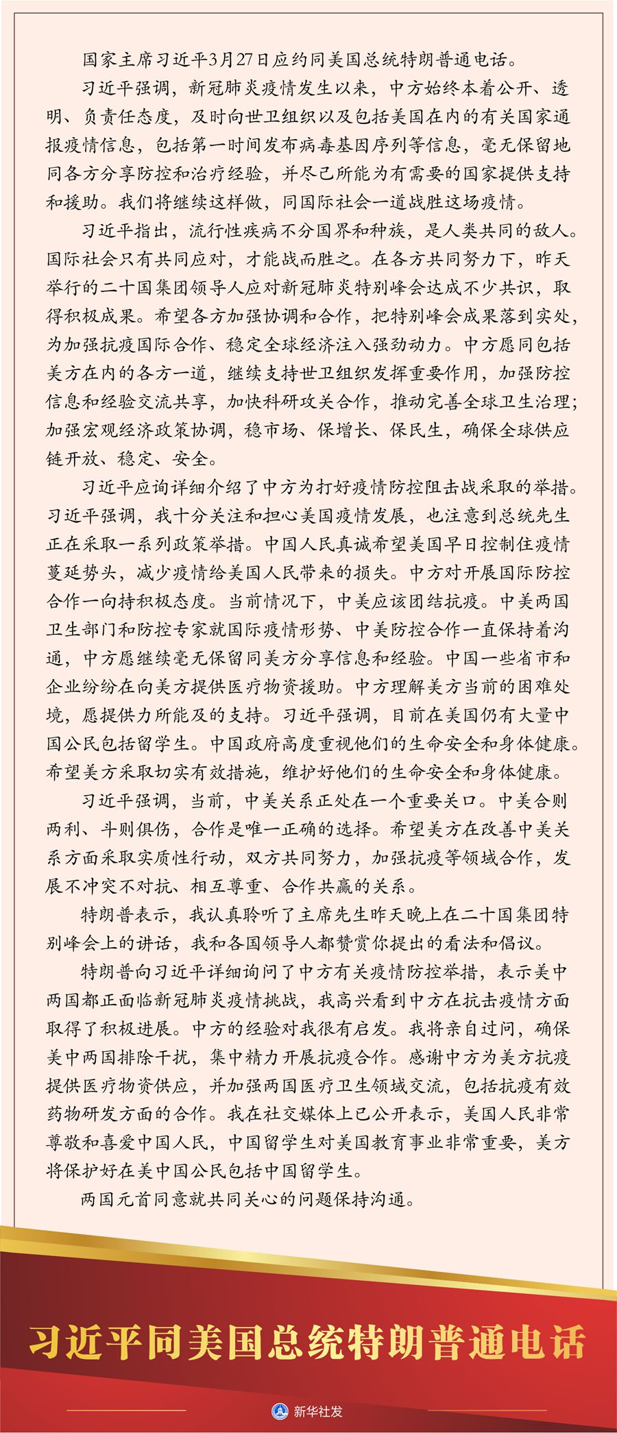 习近平应询详细介绍了中方为打好疫情防控阻击战采取的举措。习近平强调,我十分关注和担心美国疫情发展,也注意到总统先生正在采取一系列政策举措。中国人民真诚希望美国早日控制住疫情蔓延势头,减少疫情给美国人民带来的损失。中方对开展国际防控合作一向持积极态度。当前情况下,中美应该团结抗疫。中美两国卫生部门和防控专家就国际疫情形势、中美防控合作一直保持着沟通,中方愿继续毫无保留同美方分享信息和经验。中国一些省市和企业纷纷在向美方提供医疗物资援助。中方理解美方当前的困难处境,愿提供力所能及的支持。习近平强调,目前在美国仍有大量中国公民包括留学生。中国政府高度重视他们的生命安全和身体健康。希望美方采取切实有效措施,维护好他们的生命安全和身体健康。