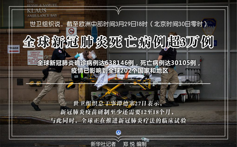 新华社日内瓦3月29日电(记者刘曲)世界卫生组织29日发布的最新数据显示,全球新冠肺炎死亡病例超3万例,达到30105例。