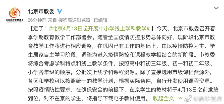 定了!北京4月13日起开展中小学线上学科教学-新华网