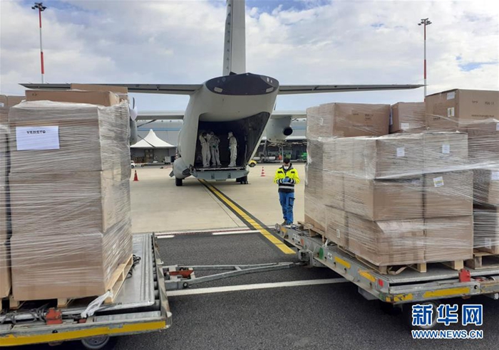 这是在意大利罗马的菲乌米奇诺机场拍摄的从飞机上卸下的医疗物资(3月30日摄)。新华社发