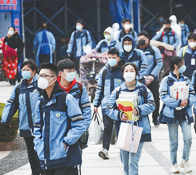 图为3月30日,江苏淮安,江苏省清江中学学生有序进入校园。赵启瑞摄(影像中国)