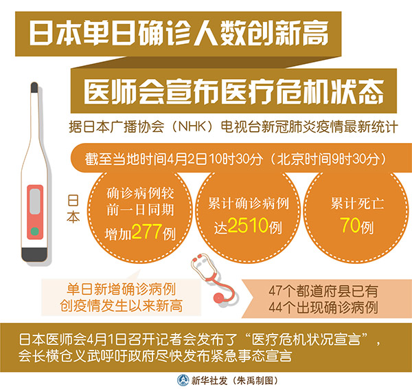 新华社东京4月2日电(记者华义)据日本广播协会(NHK)电视台新冠肺炎疫情最新统计,截至2日10时30分(北京时间9时30分),日本确诊病例较前一日同期增加277例,单日新增确诊病例创疫情发生以来新高。
