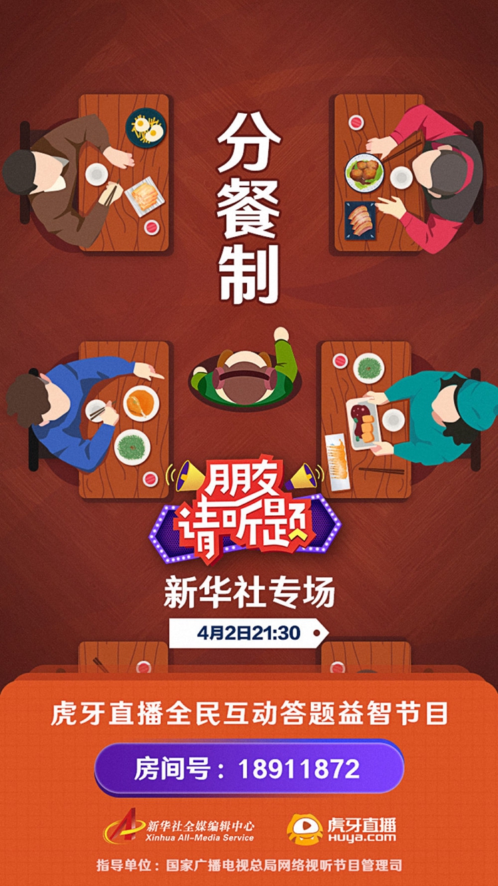 4月2日21:30,大家在最新版的虎牙直播内搜索《朋友请听题》,即可直接进入直播间,找到答题入口参与活动,答对12题就可分享现金大奖!